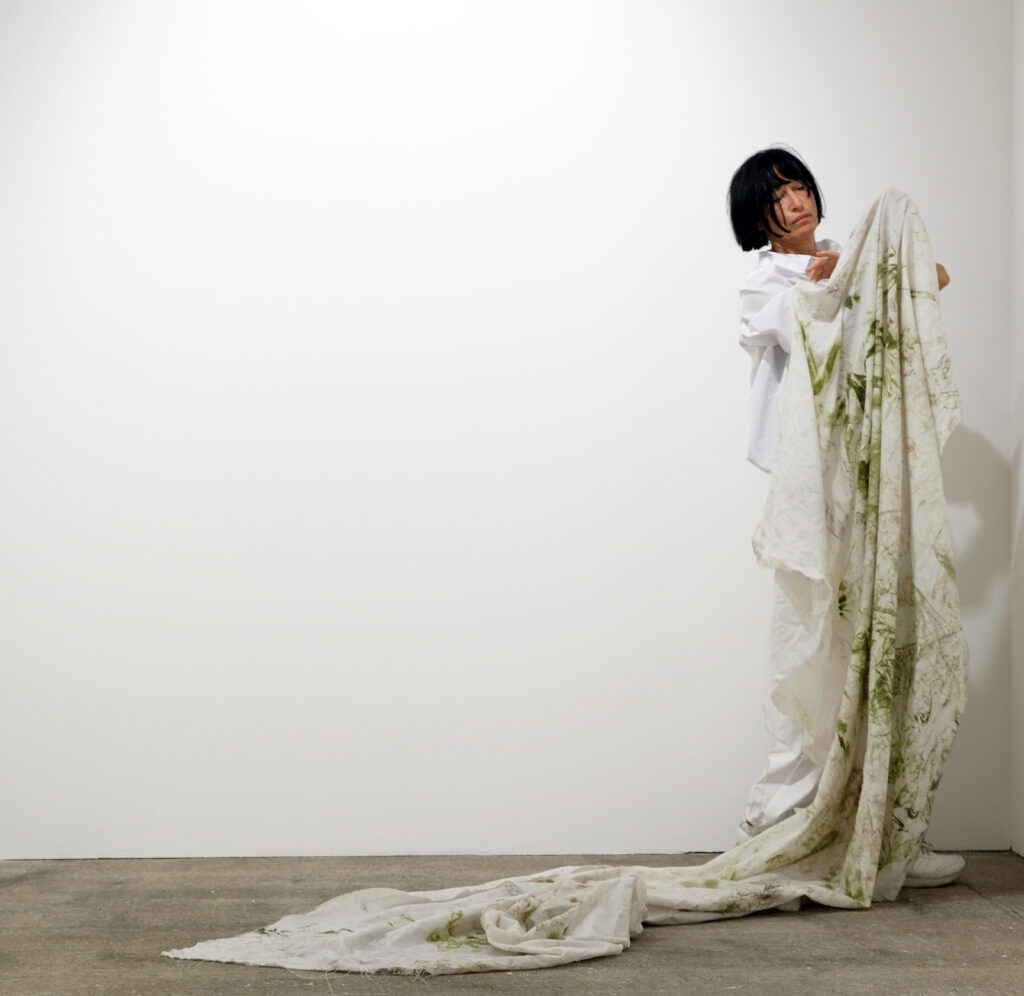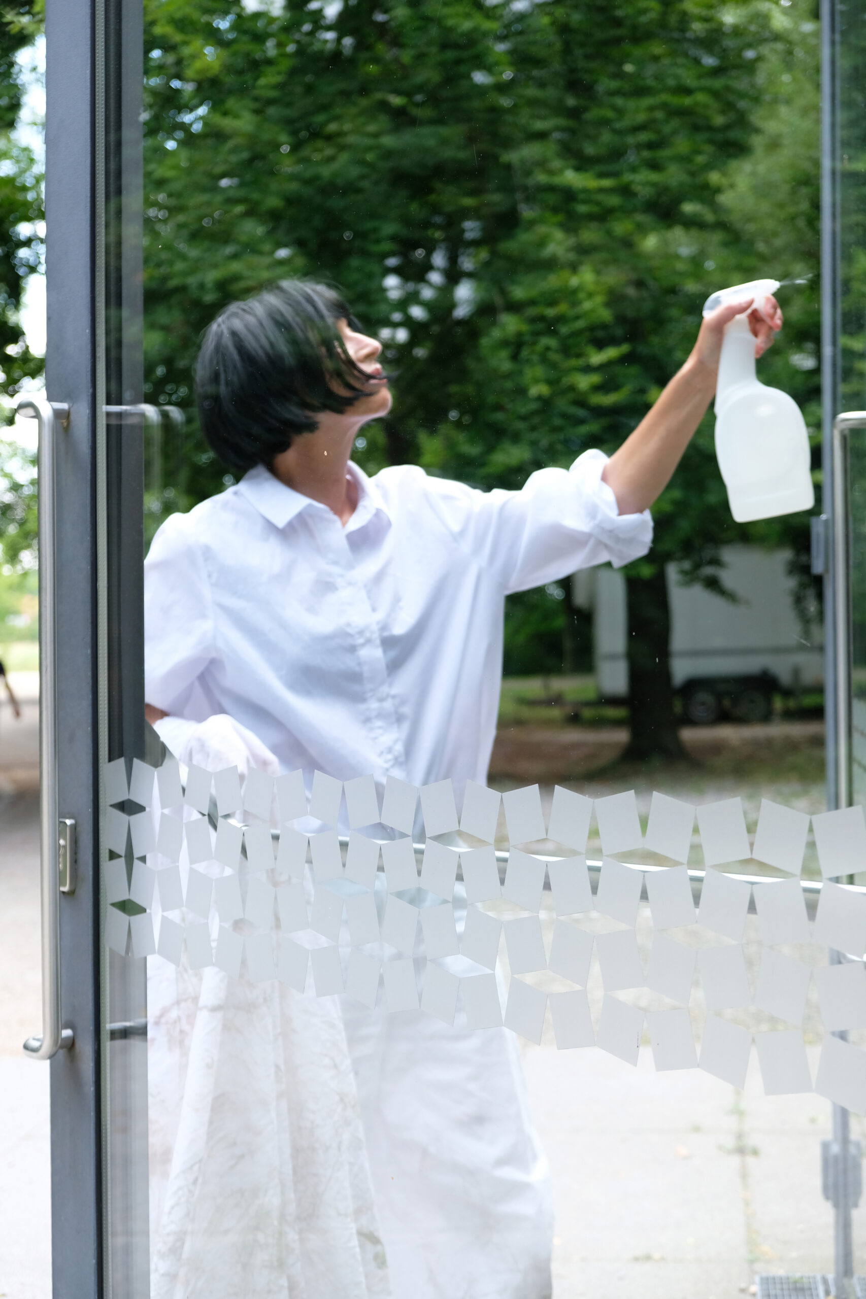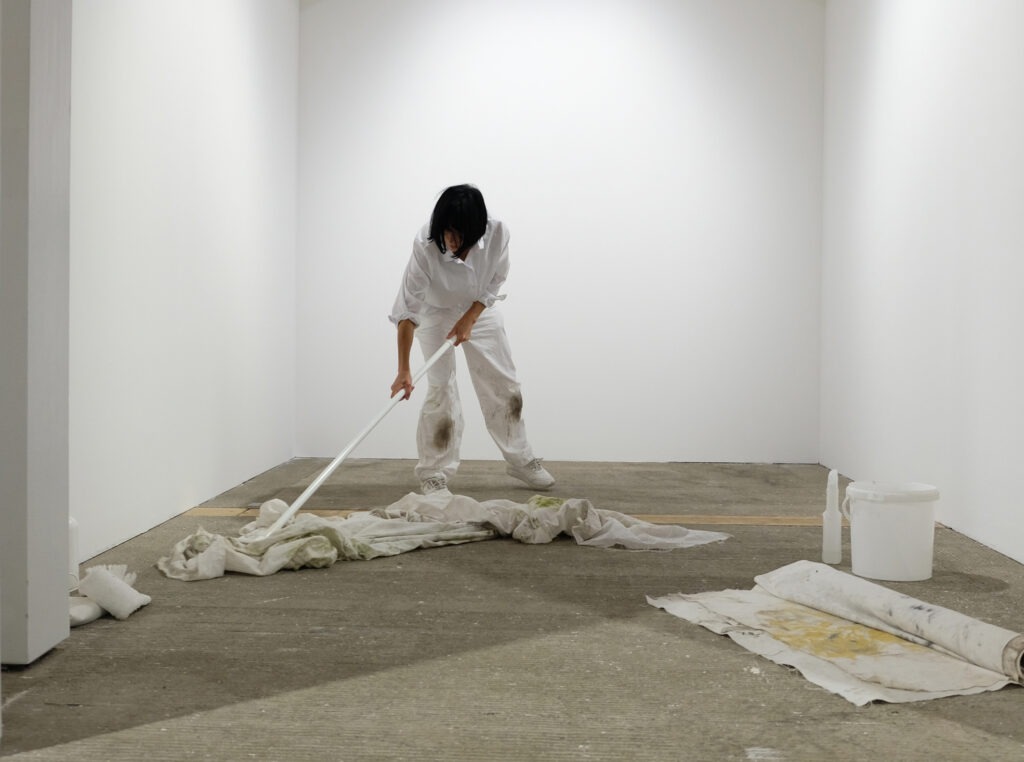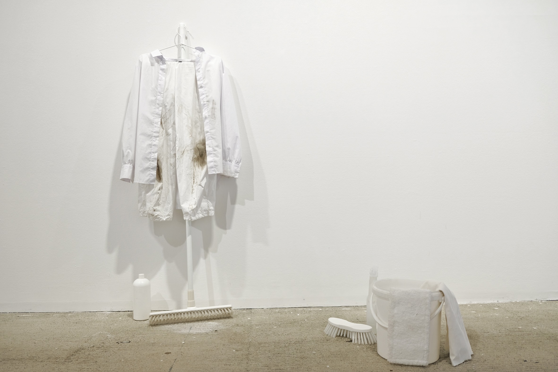 Die Arbeit beleuchtet den intensiven Prozess der Gebäudereinigung. Verborgenes wird sichtbar, Kleinstpartikel erzählen von früherer Nutzung, nach und nach erschließen sich unerwartete Eigenheiten und Details. Fragen an den Raum tun sich auf. Wer benutzte ihn? Wer putzte ihn? Oder: Was wird aus ihm? Die weißen Tücher absorbieren den Schmutz des Gebäudes und nehmen allmählich Farbe an. Ein abstraktes Bild tritt zum Vorschein. Dabei dokumentiert eine am Körper angebrachte Kamera die arbeitenden Hände.
